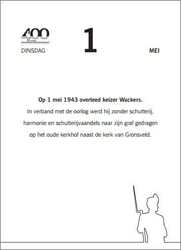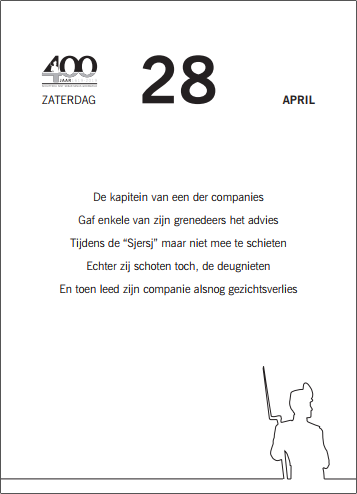 Het plan is ontstaan om een bijzondere scheurkalender te maken. Geen gewone kalender dus, maar een kalender met 400 pagina’s, lopend van 27 april 2018 tot en met 29 juni 2019. Elke dag scheurt u een blad van de kalender en elke dag komt u een dag dichter bij het feest. Op elke bladzijde van de kalender wordt een wetenswaardigheid vermeld over de schutterij. De kalender is uitgevoerd in A5 formaat en geïllustreerd met tekeningen, foto’s en gedichtjes. We denken dat u met deze kalender alvast in de stemming wordt gebracht voor ons feest in 2019. Voor de prijs hoeft u het niet te laten. We kunnen deze kalender met 400 teksten en illustraties, aanbieden voor 10,- per stuk. Inmiddels zijn er al ruim 1000 kalenders verkocht en zijn er nog enkele kalenders te koop bij Willie van Wel.