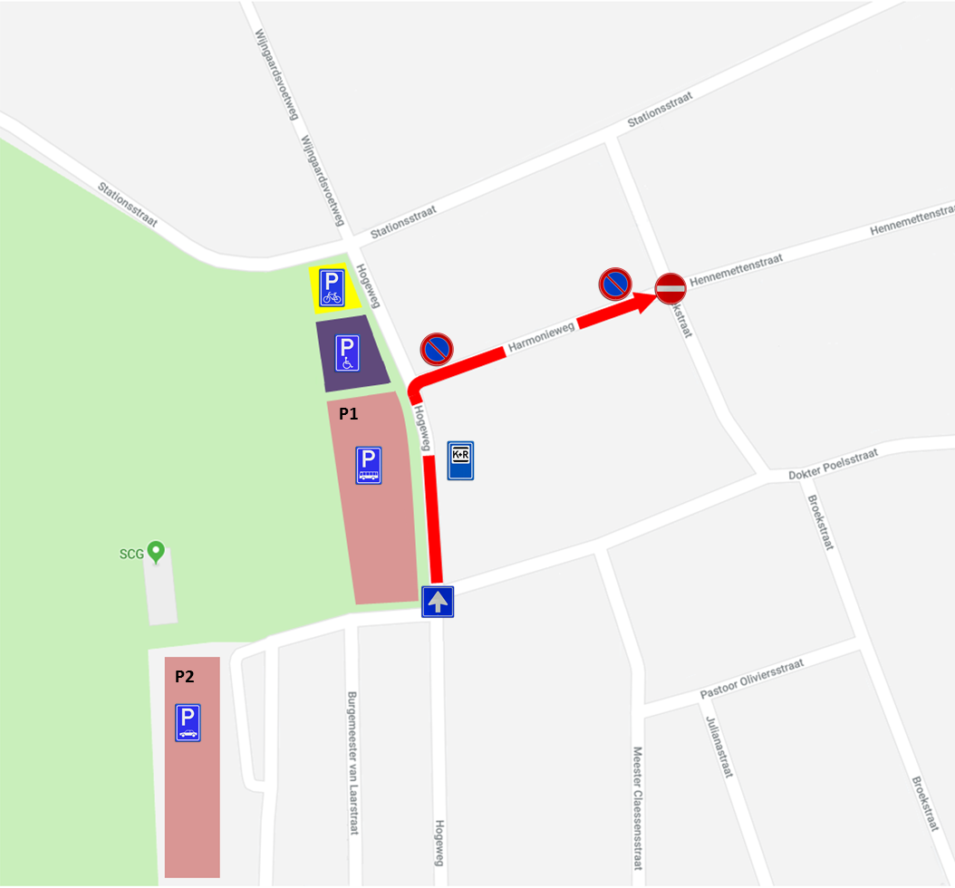Bezoekers met eigen vervoer kunnen op vrijdag en zaterdag parkeren op P1 en P2. Op zondag is P1 enkel voor bussen. Naast P1 op de Hogeweg zijn invalide parkeerplaatsen. Taxi's/ auto's (halen en brengen) kunnen gebruik maken van de Kiss and Ride, ter hoogte van P1 op de Hogeweg. Ook is er op de hoek Stationsstraat/Hogeweg een fietsenstalling gerealiseerd.