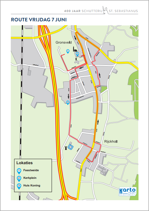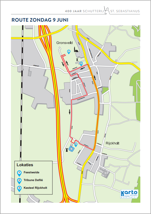 Op zondag 09-06-2019 tussen 13:00 uur en 16:00 uur zullen voor het defilé de volgende wegen worden afgesloten. De Rijksweg in Gronsveld vanaf T-splitsing Rijksweg/Kampweg tot aan de oprit van de A2 in Rijckholt en gehele Kasteelstraat.
